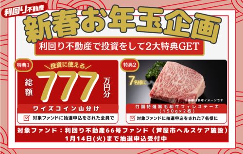 こんばんは!このキャンペーン規模は凄いですね!のSAITAMANです。 新規特大キャンペーン開催中! ①新規登録完了でアマギフ2,000円分プレゼント! ②初回投資額に応じて最大50万円分プレゼント! 利回り不動産にて、「新春お年玉企画」として、超特大キャンペ…