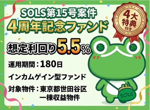 こんばんは!手堅い不動産クラファン大好きSAITAMANです。 4周年記念×4大特典! 不動産クラウドファンディングSOLS(ソルス)にて、「SOLS第15号案件:4周年記念ファンド」が公開されました! 本ファンドでは、4周年記念ということで、4大特典があります! …