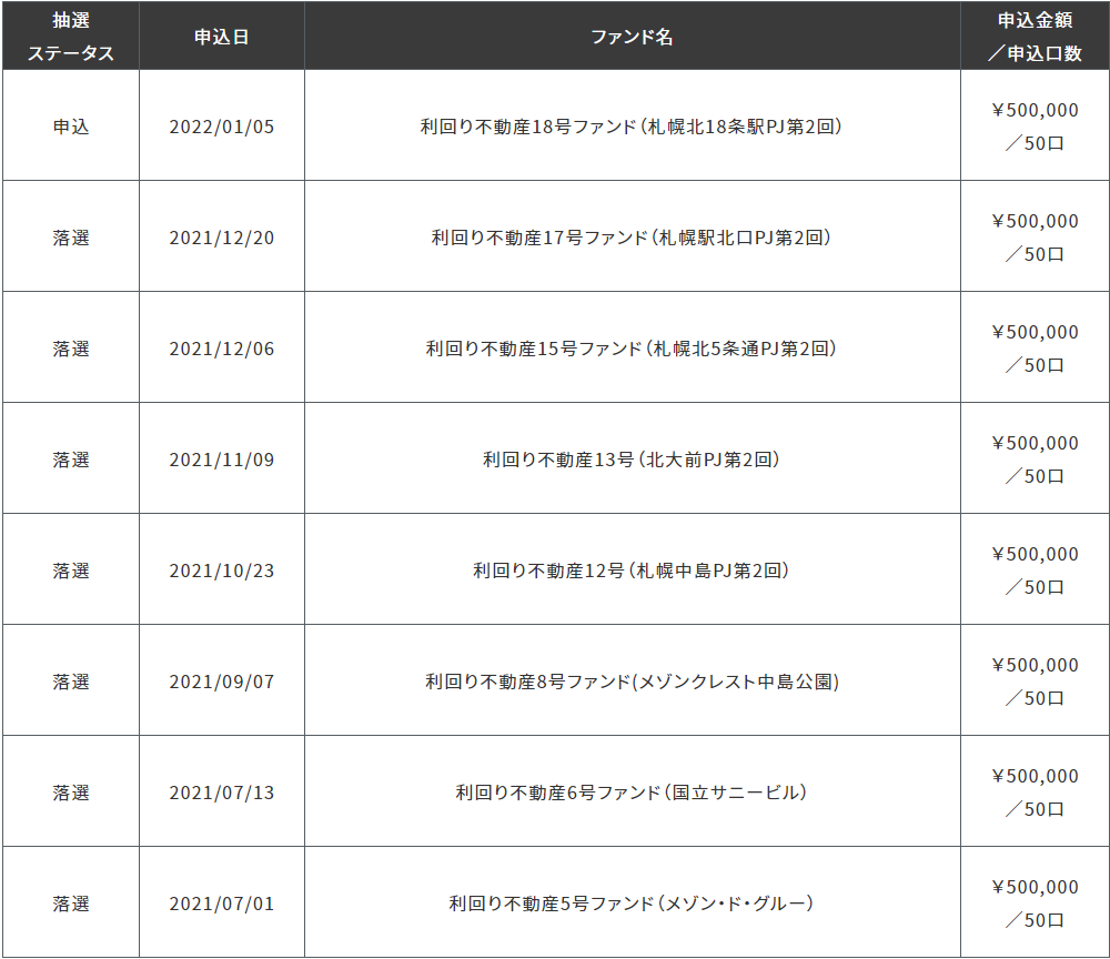 私も、好みの小規模区分マンション案件ですし、本ファンドに投資申込させていただきました。