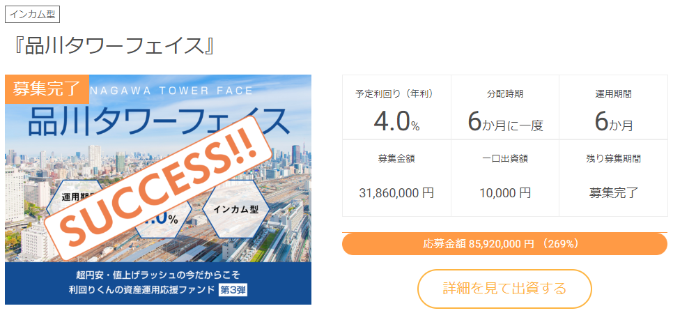 本ファンドについては、先着方式での募集にも関わらず、キャンセル待ちが出て269%の応募を集めました。