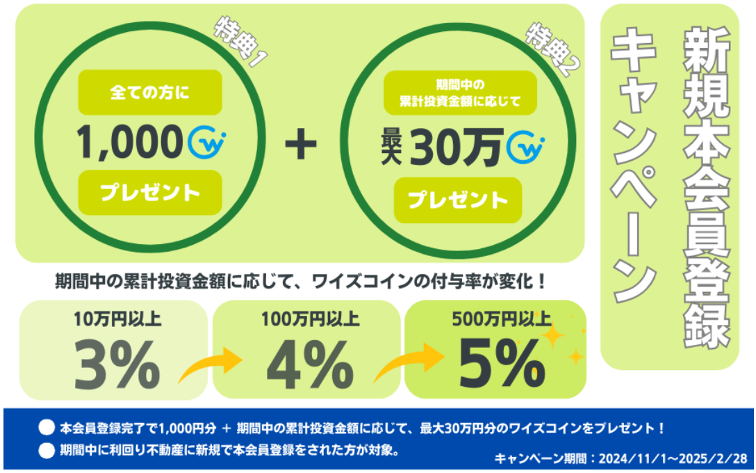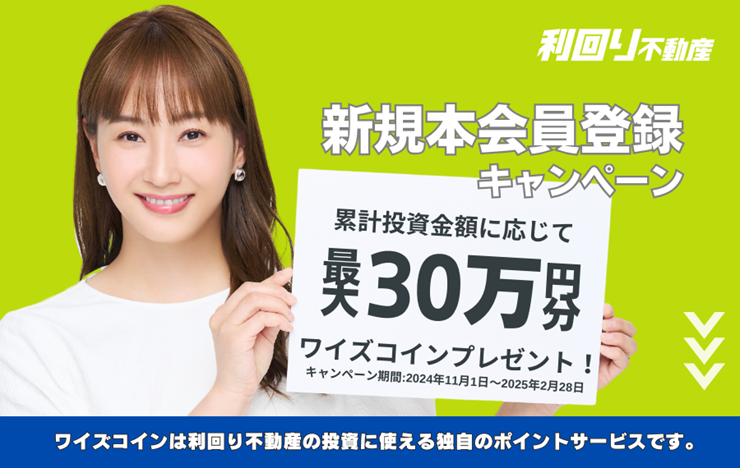 投資に利用したり、Amazonギフト券と交換できる独自コインを導入している利回り不動産にて、2024年11月1日以降に本会員登録を完了されたお客様を対象に、本会員登録完了月を含む、3か月間の累計投資金額に応じてワイズコインを最大30万円分プレゼントされるキャンペーンが開始されました!