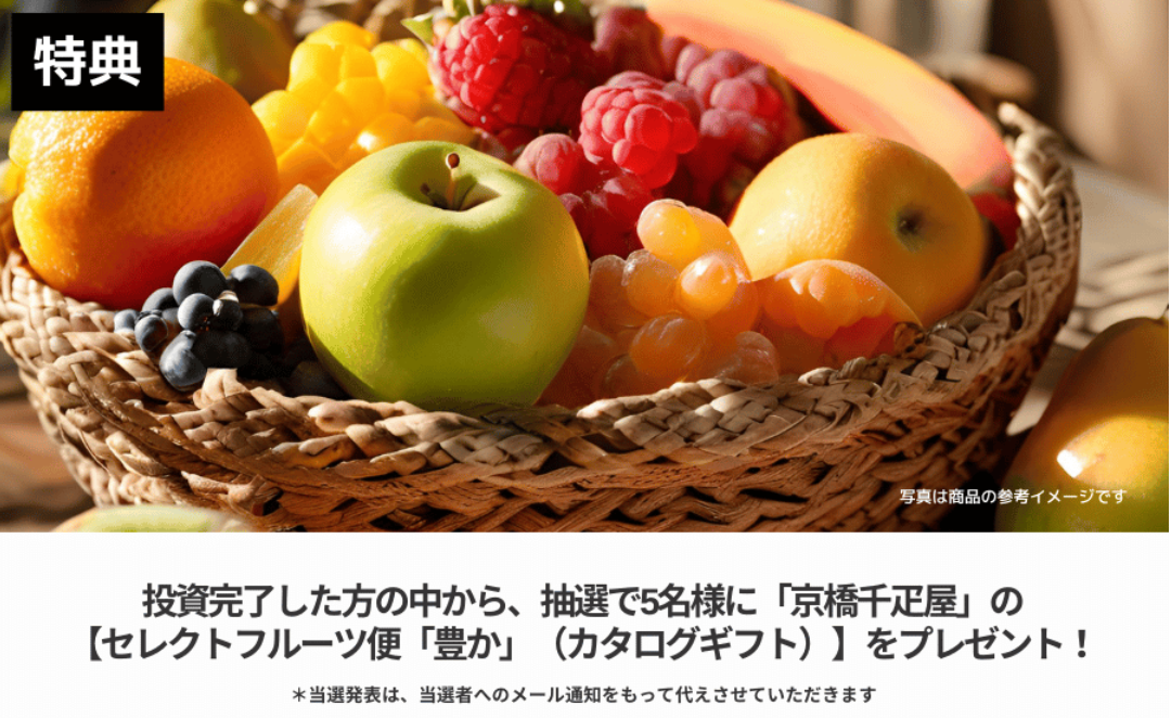 本ファンドに投資完了した全員の中から抽選で5名様に、「京橋千疋屋」の【セレクトフルーツ便「豊か」(カタログギフト)】をプレゼント。